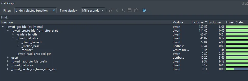 dwarf_get_fde_list_eh, which is where libdwarf extracts the list of all functions (FDE) from the.eh_framesection - The extraction phase in blue (~1s 7ms): multiple calls to