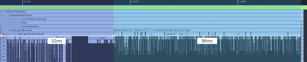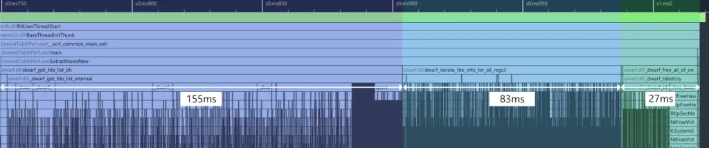 dwarf_get_fde_info_for_all_regs3_b(one per function) which is where the unwind rows are extracted - The shutdown phase in green (~27ms): shutdown of libdwarf, where the .so file and related data is destroyed/unloaded